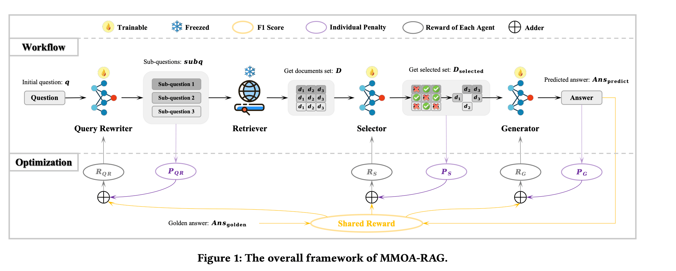 Most optimization techniques currently treat these modules independently, relying on supervised fine-tuning (SFT). However, this method creates a disconnect between module-specific goals and the final objective—producing the most accurate and contextually appropriate response. Some research has examined the use of reinforcement learning (RL) to enhance RAG. Still, these approaches often focus on simplistic pipelines, optimizing only one or two components at a time. MMOA-RAG redefines this paradigm by treating the entire RAG pipeline as a multi-agent system, where each module is an RL agent working towards a common goal.