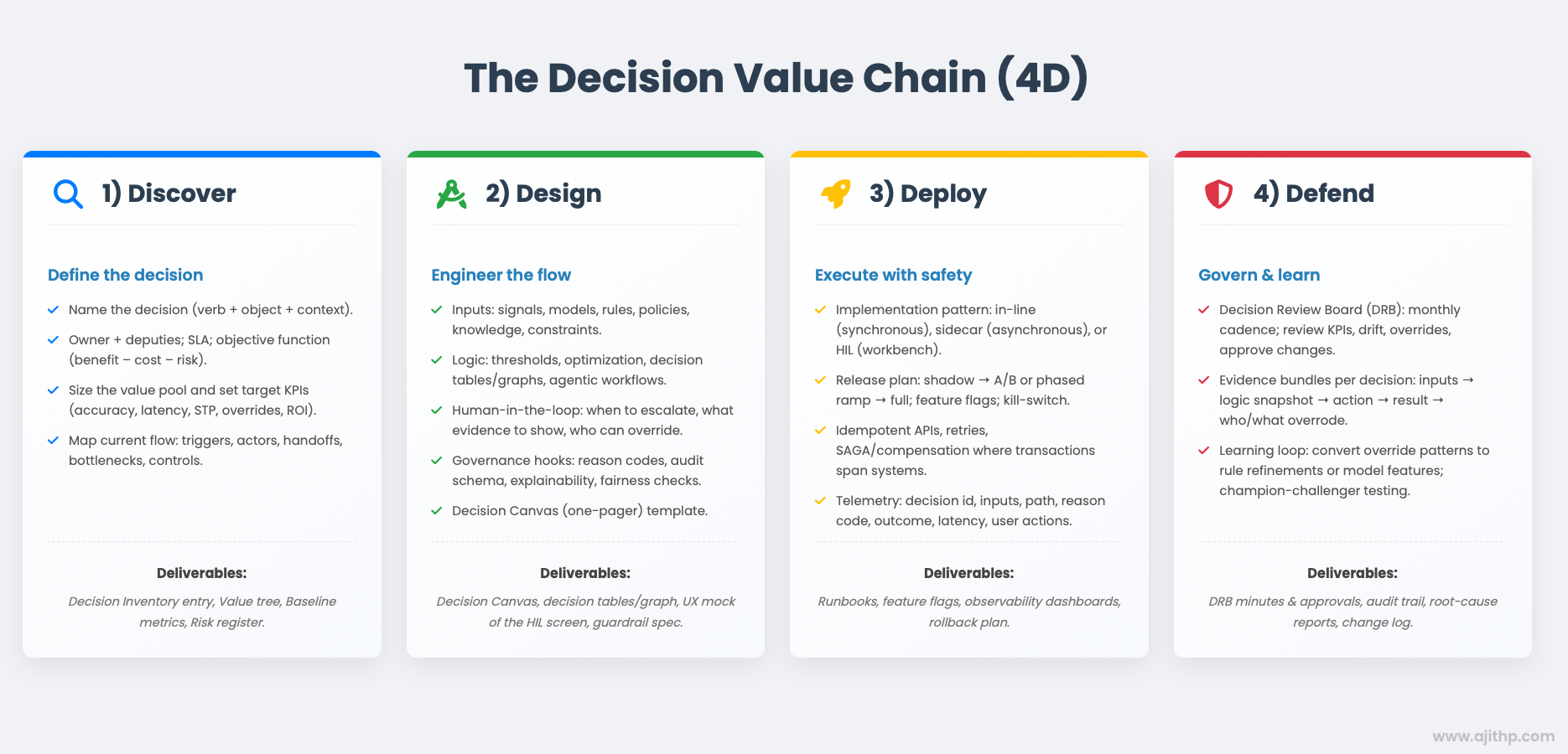 - Implement the DI cycle. Define → Design → Deploy → Defend, ensuring evidence is mandatory and promotion gates are linked to decision KPIs.