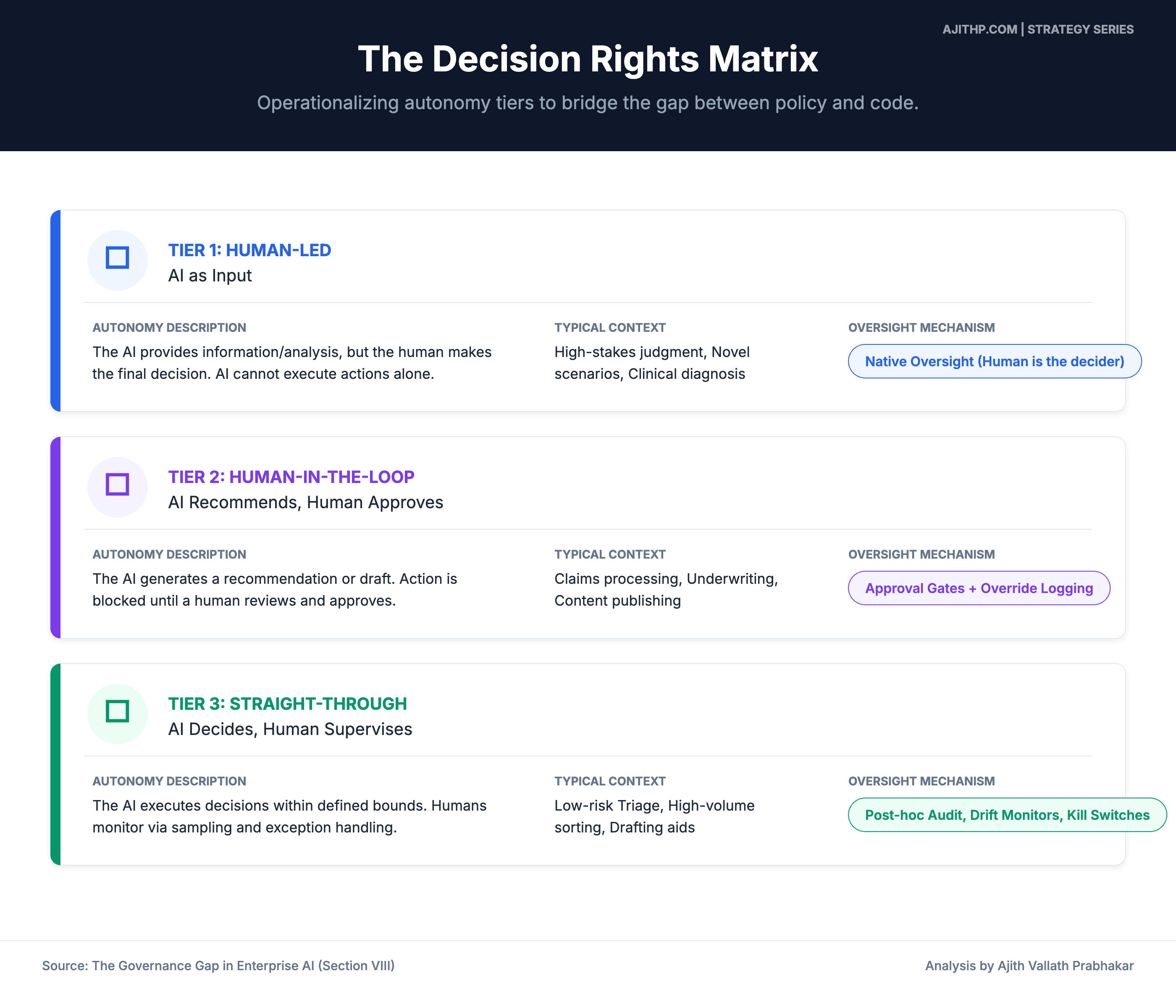 - Own the decision rights architecture. Establish and maintain the Decision Rights Matrix. Approve autonomy tiering for high-risk decisions. Ensure escalation and override pathways actually work.